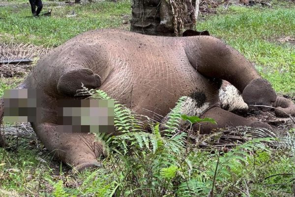 LAHAD DATU: Seekor gajah pygmy Borneo betina ditemui mati di kawasan Blok 57, FELCRA Berhad Estate Danum, semalam. Pengarah Jabatan…
