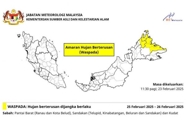 KUALA LUMPUR : Jabatan Meteorologi Malaysia (MetMalaysia) hari ini mengeluarkan amaran hujan berterusan tahap waspada di beberapa kawasan di Pantai…