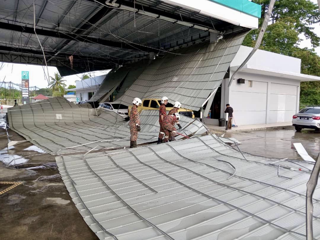 KINABATANGAN : Enam kenderaan mengalami kerosakan selepas berlaku runtuhan pada siling Stesen Minyak Petronas di Batu 8 Bukit Garam, Kinabatangan di sini petang tadi.