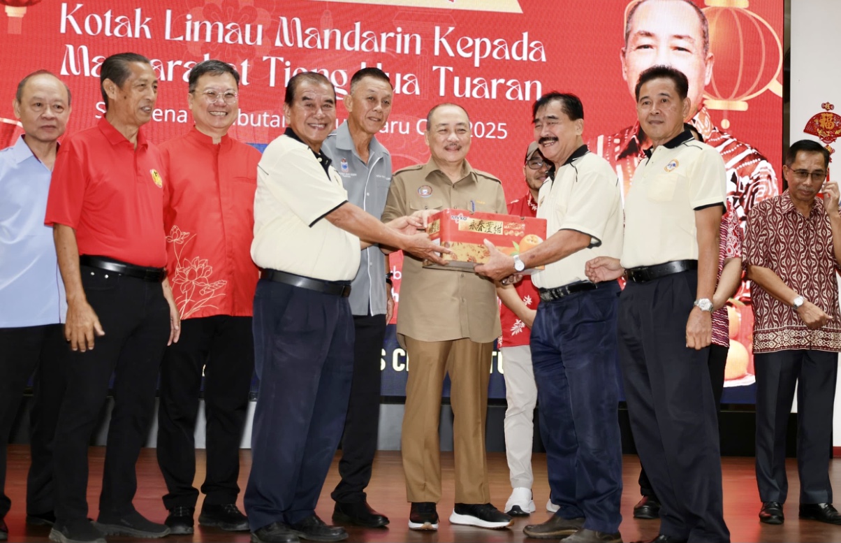 TUARAN : Ketua Menteri, Datuk Seri Panglima Hajiji Noor menyerahkan sumbangan kotak limau mandarin kepada masyarakat Tionghua sempena Tahun Baharu Cina, di Dewan Serbaguna Sekolah Jenis Kebangsaan (C) Chen Sin, di sini, hari ini.