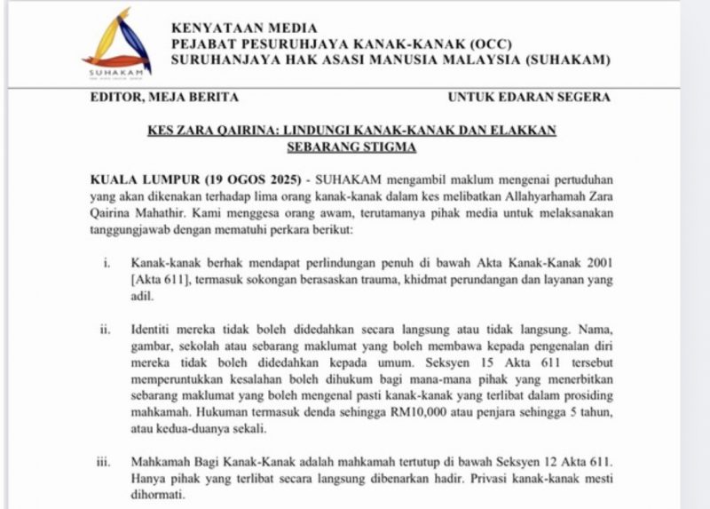 Menerusi kenyataan hari ini, SUHAKAM menggesa orang awam dan media supaya bertindak penuh tanggungjawab serta mematuhi undang-undang, khususnya membabitkan hak perlindungan kanak-kanak.