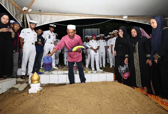 Arman San, 28, yang meninggal dunia dalam operasi salvaj KD Pendekar semalam, dikebumikan mengikut istiadat Tentera Laut Diraja Malaysia (TLDM) dengan dibantu penduduk setempat.