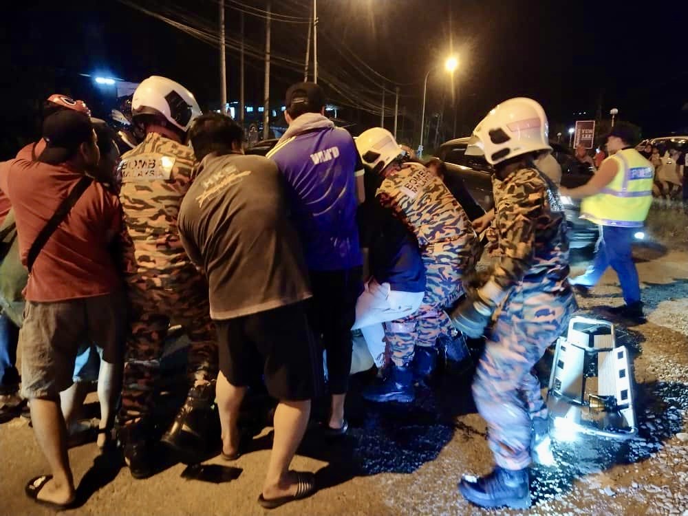 Katanya, pasukan Bomba bersama orang awam bertindak membantu mengangkat kenderaan bagi mengeluarkan mangsa.