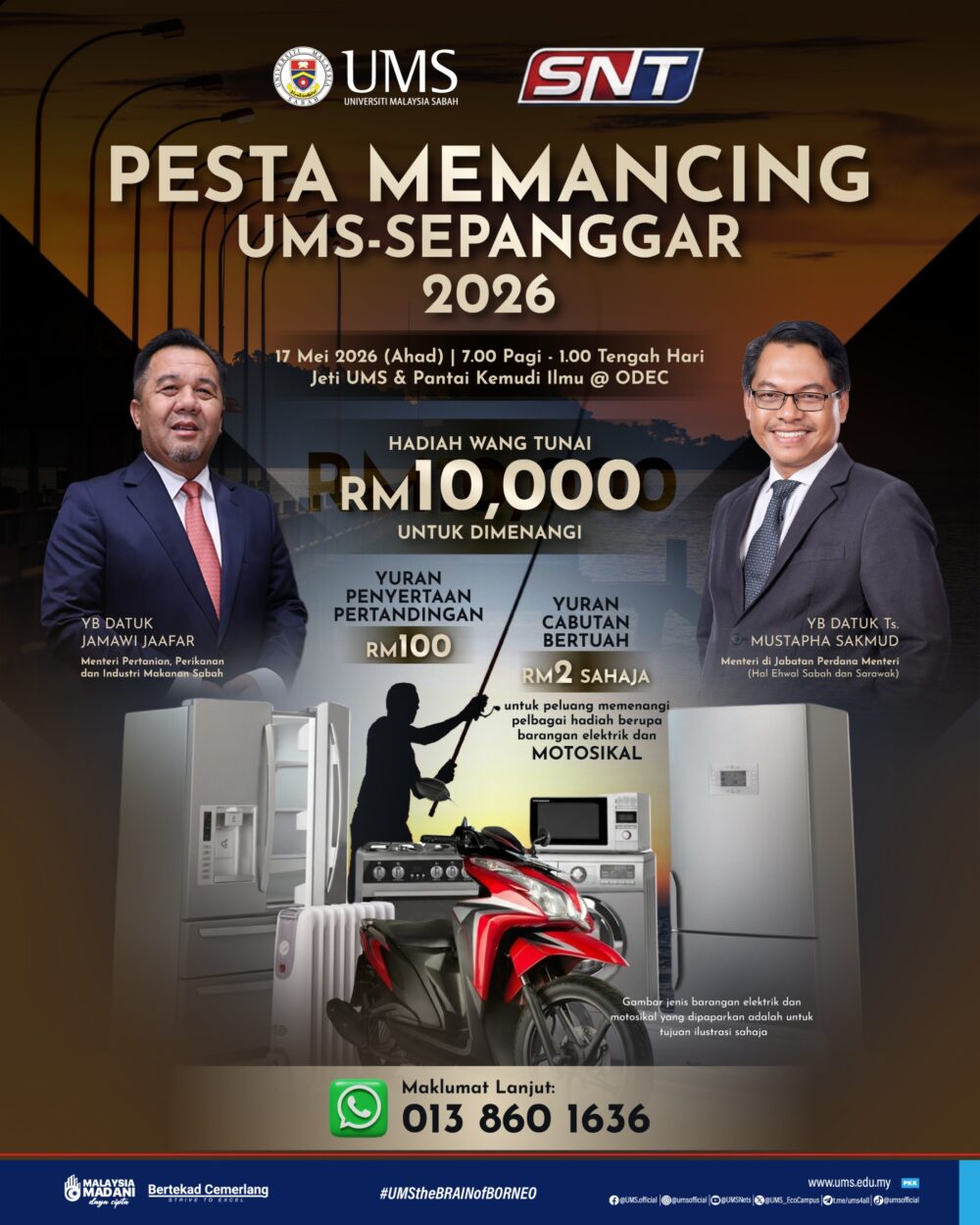KOTA KINABALU: Pesta Memancing Sepanggar 2026 bakal berlangsung pada 17 Mei ini di Jetty ODEC, Universiti Malaysia Sabah (UMS), dengan menawarkan hadiah utama RM10,000 kepada pemenang.