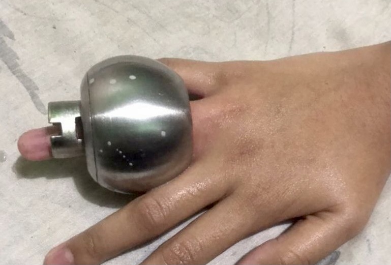 Katanya, anggota bomba mengambil masa selama 12 minit untuk memotong tombol tersebut sekali gus bernasib baik mangsa tidak mengalami sebarang kecederaan.