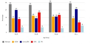 “UMNO/BN terkuat dalam kalangan pengundi tertua atau dalam lingkungan umur 65 ke atas (28 peratus) yang mencadangkan asas pengundi tradisionalis atau warisan.